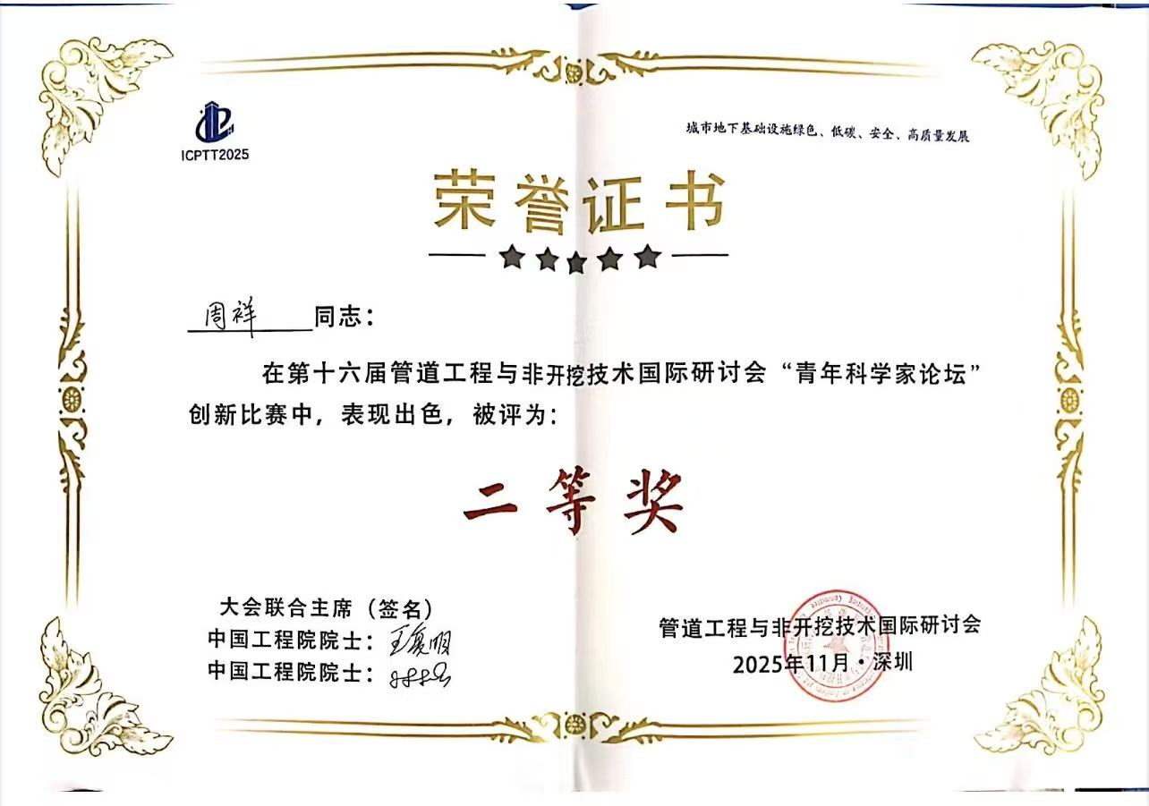 研究生周祥在第16届管道工程与非开挖技术国际研讨会“青年科学家论坛”创新比赛中获二等奖