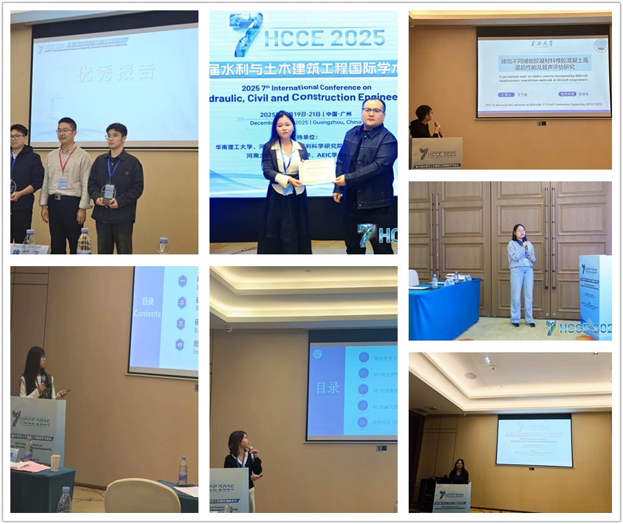 多名研究生积极参会并登台作学术汇报,充分展现了扎实的科研素养与创新研究能力。其中,2024级研究生群体表现亮眼:张振刚以《基于AE和DIC的含缺陷木梁受弯损伤性能试验研究》为题作汇报,系统探究含缺陷木梁的受弯损伤机理与破坏模式,创新性提出AE-DIC联合裂纹识别方法,为木结构安全性能评估及古建筑保护提供了重要理论与技术参考,其汇报获评“优秀口头报告奖”;何霞汇报《废玻璃骨料混凝土GFRP-钢管双层管柱在轴压作用下的性能试验研究》,提出采用废玻璃骨料与GFRP-钢双层管复合的新型结构(WGAC-DSTC),为废玻璃资源化利用及高性能复合结构耐久性设计提供了关键理论依据与数据支撑;汪艺凯围绕《不同辅助胶凝材料掺合橡胶混凝土高温后性能研究》作学术汇报,深入探讨辅助胶凝材料对橡胶混凝土高温性能的优化机理,为提升橡胶混凝土高温耐久性、推动固废资源化利用提供了理论依据与技术路径;刘平圆以“Integration of resilience-based community physical infrastructure system performance and community performance correlation relationships”为题汇报,为社区韧性目标的逐级落实、基础设施系统性能优化及多层级协同防灾减灾设计提供了理论依据与技术支撑;张蓉蓉作《基于分子模拟的新旧沥青融合行为研究》学术汇报,从分子尺度系统探究再生剂调控下新旧沥青界面融合的机制及影响因素,为高效再生剂研发与RAP高利用率提供了重要参考;曾月以《纳米TiO₂/SiO₂改性水泥石光催化性能及力学性能研究》为题作汇报,采用超声分散与聚羧酸减水剂联用技术优化材料分散性,系统探究单掺与复掺对水泥石力学性能、光催化效率及耐久性的影响;邹晨曦作《基于TiO₂/g-C₃N₄复合涂层的功能化水泥砂浆:可见光催化、自清洁与耐久性研究》分享报告,优化TiO₂/g-C₃N₄复合材料制备工艺,筛选出适配水泥砂浆的最优涂层体系及TCN掺量,为室外光催化功能化建材应用提供了技术支撑。