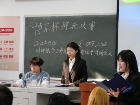 主办的第九届“博弈杯”辩论赛决赛于西校区6教106教室进行。本次辩论赛由主席戴秦天,院辩队员叶爽主持,并邀请校辩队长戴洢洢,校辩队员贾力,校辩队员高玉龙担任评委。