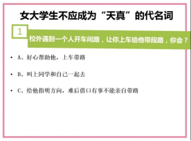 从第三个话题“面对熟识或陌生的坏蛋们”,王老师同样通过举例的形式,表明“女大学生不应成为天真的代名词”这一观点,呼吁女孩子在今后的学习生活中要提高警惕,提高安全防范意识,保护好自己,自尊自爱,让青春之花绚丽绽放。