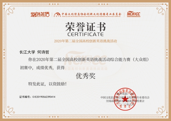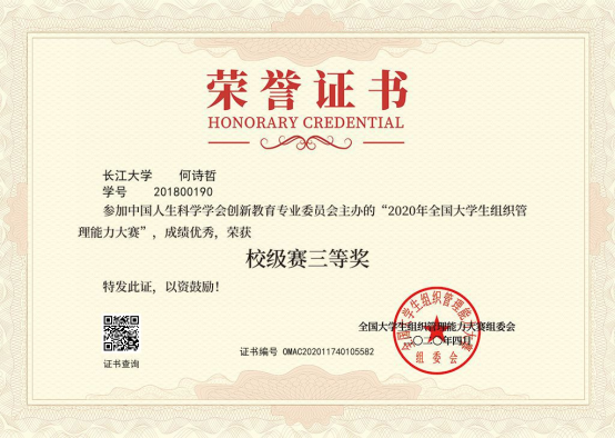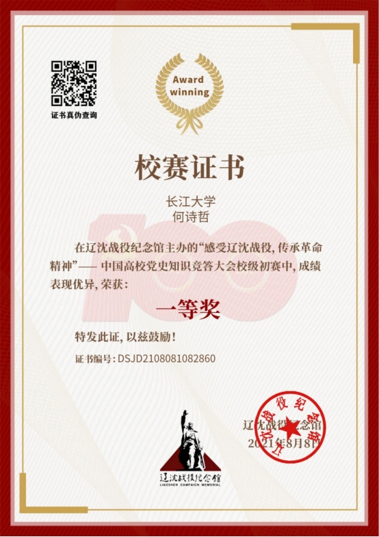 何诗哲: 2020年第二届全国高校创新英语挑战活动综合能力赛(大众组)优秀奖, “2020年全国大学生组织管理能力大赛”校级赛三等奖 , “感受辽沈战役,传承革命精神”—中国高校党史知识竞答大会校级初赛一等奖