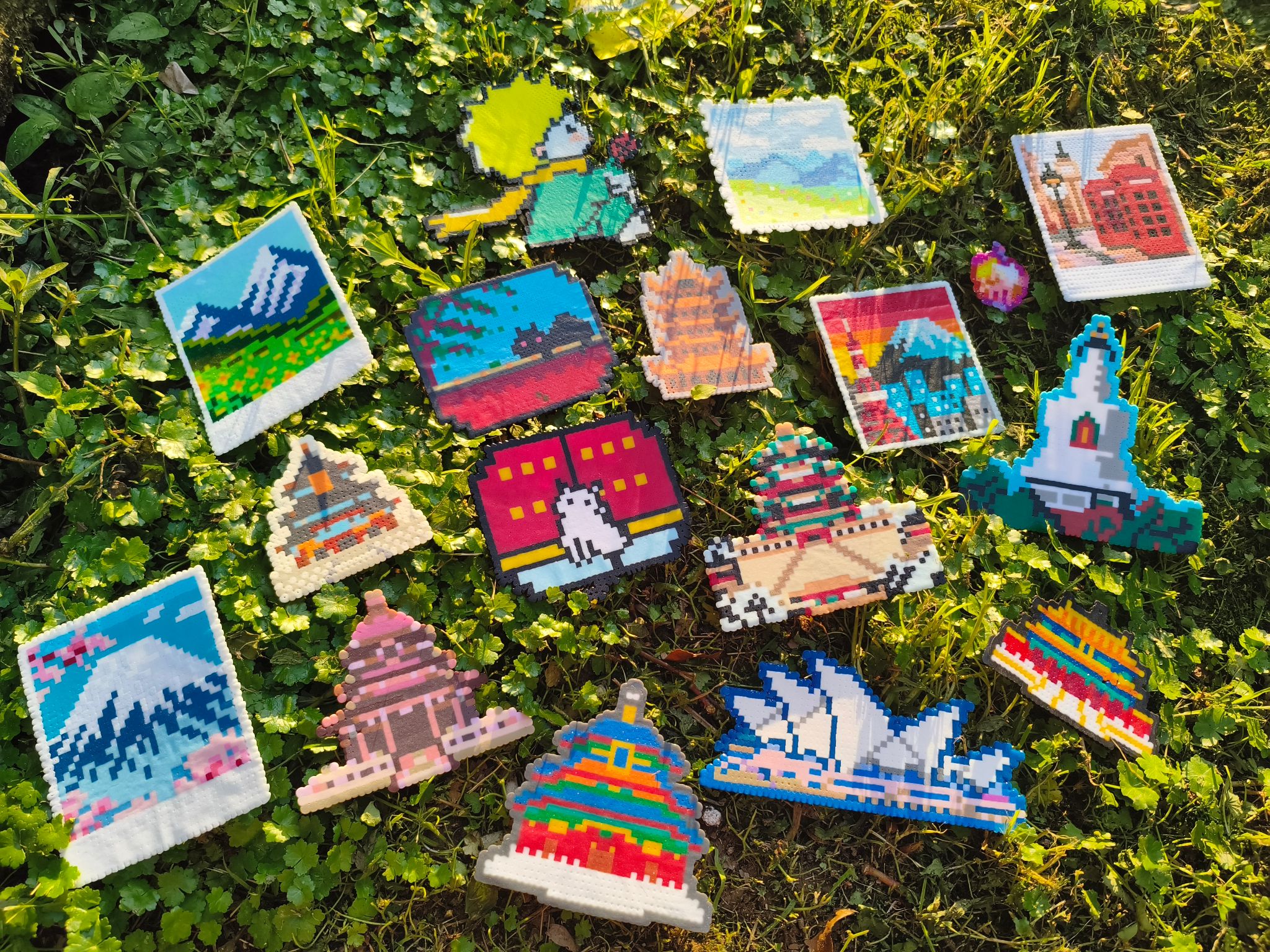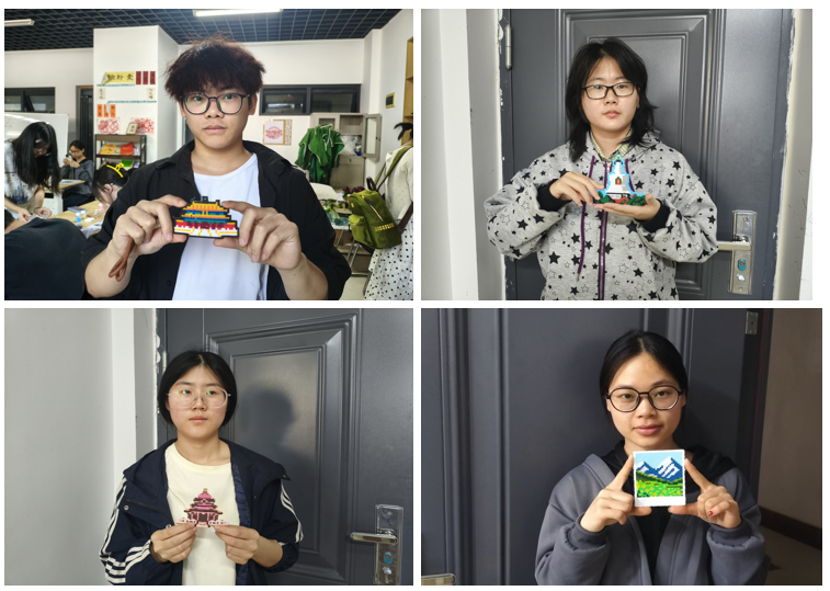 经加热定型后,一件件拼豆作品呈现出清晰的建筑轮廓与明快的色彩搭配,体现了专业特色与艺术美感的结合。活动最后,参与学生与作品合影留念。